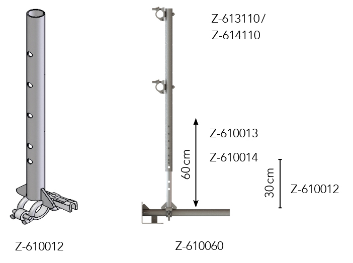 Flat roof railing brackets, together with coupled post brackets, are mounted at a distance of 2 to 3,20 m, depending on the masonry. Only scaffolding tubes with a diameter of 48,3 mm or aluminum beams may be used as railings.